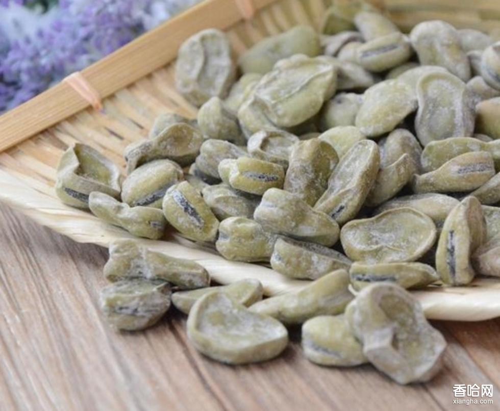 用干蠶豆(當(dāng)?shù)厝私辛_漢豆)泡浸后瀝干,與首香、栓皮、食鹽和食用山茶人鍋,放上適量的水,用文火慢煮,使調(diào)味品汁從表皮至豆肉吸收,持水分基本煮干后,離揭鍋冷卻,即成苗香豆。這種茵香豆是青黃色。表皮起皺,豆韌軟耐嚼,清香味甘。
