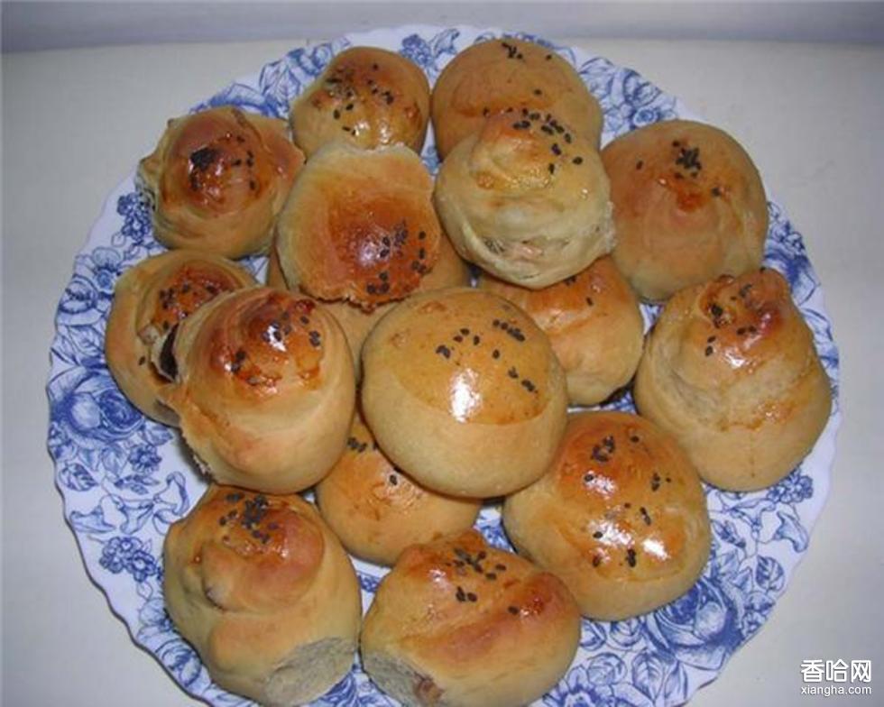 食堿燙酵面1000克,精面粉500克,豬肥膘肉300克,蔥60克,甜醬瓜200克,蝦米、飴糖各20克,京冬菜40克,料酒20克,精鹽50克,芝麻13克,芝麻油5克,熟豬油230克。