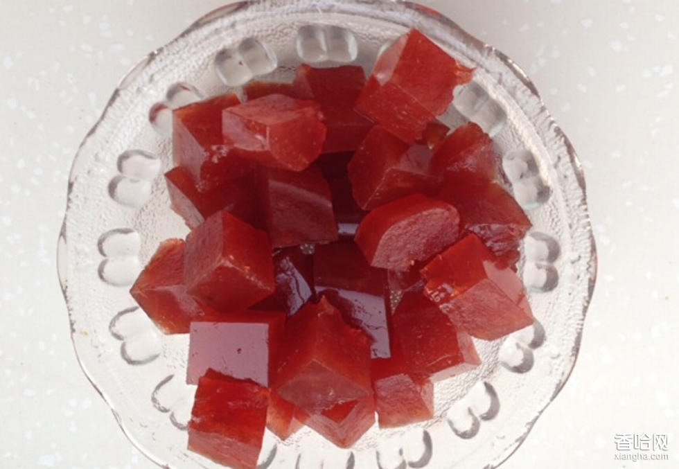 山楂糕是一道流行于北方地區(qū)的漢族民間糕點,取山楂果汁,配以白糖、瓊脂,凍結(jié)成板??诟兴?xì)膩,甜美冰涼可口,是一種很不錯的有藥用食品。其味甘冽微酸,具有消積,化滯、行瘀的食療價值。