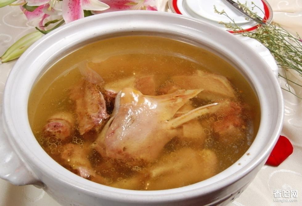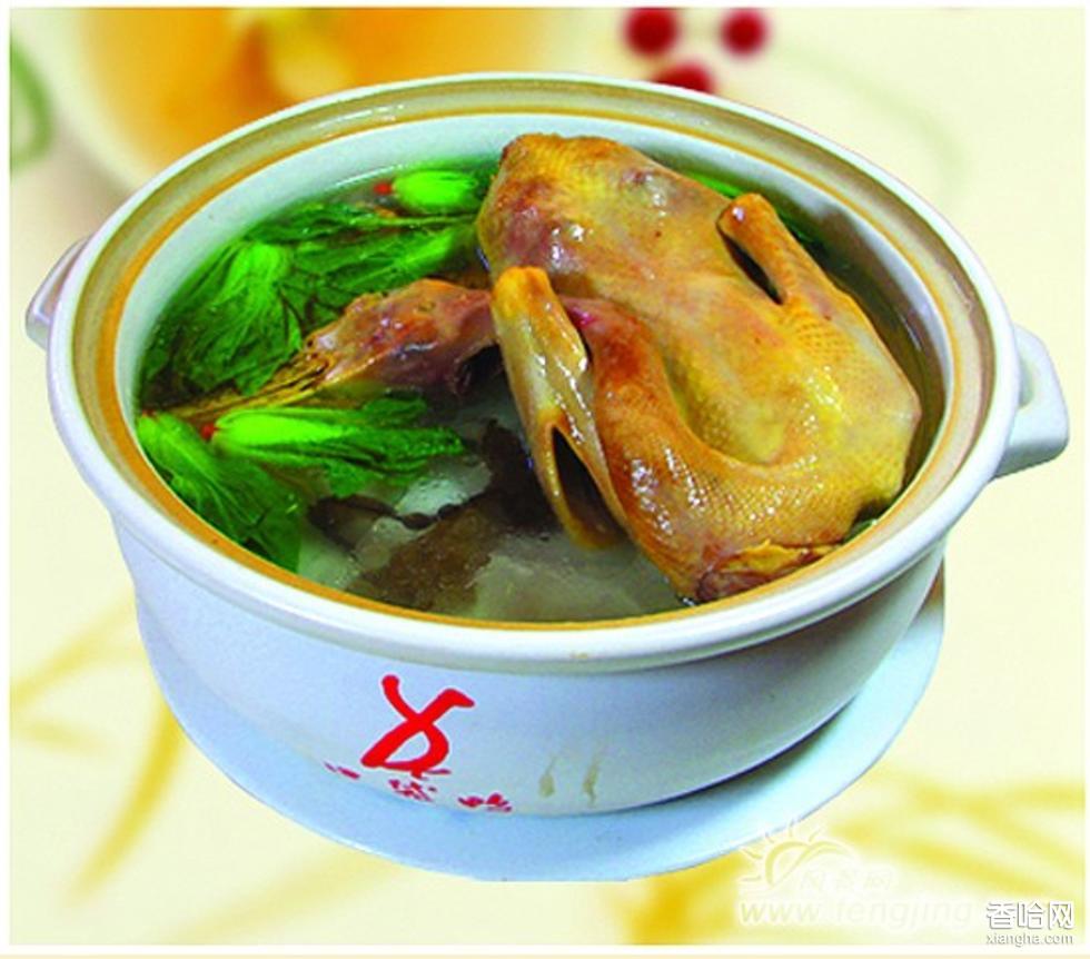 三口塘老鵝湯是用當(dāng)?shù)剞r(nóng)民自然放牧的成年白鵝,現(xiàn)食現(xiàn)殺,加入鹽、味精、生姜、冰糖、料酒、香蔥等多種配料,用文火墩爛。其特色是湯色紅潤油亮,肉爛而不碎,湯油而不膩,味道鮮美,湯味醇厚,食后回味無窮,用老鵝湯泡鍋巴又香又脆。