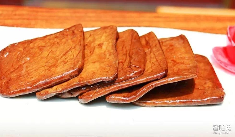 白橋茶干,是安徽和縣著名的漢族小吃,久負(fù)盛名,有80多年歷史。以黃豆為主要原料制成干坯入鍋后,用隔年的陳醬煮,再加上八角、丁香、甘草、白芷、桂皮、冰糖等精制而成,色澤紅潤,柔韌相濟(jì),越嚼越香,營養(yǎng)豐富。