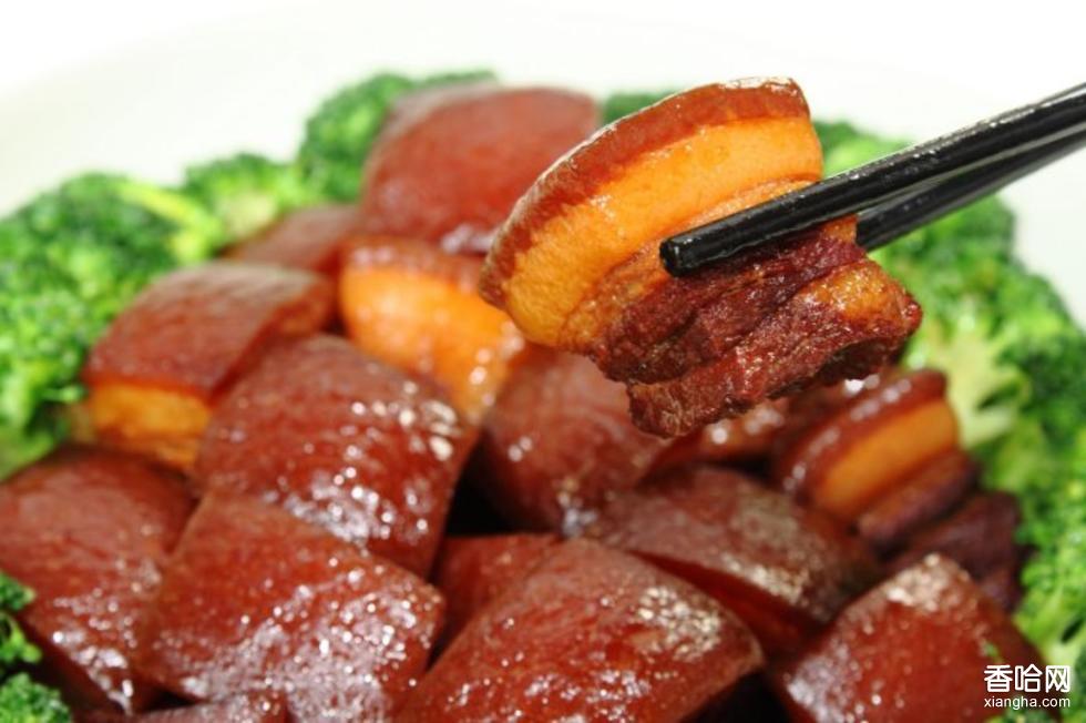 3、取砂鍋一只,內(nèi)墊竹血箅,放入蔥姜,把肉塊皮朝上排放入鍋,加百花酒、白糖、精鹽、置旺火上燒沸,再加清水、醬油、蓋上鍋蓋,用微火燜1小時(shí)至酥爛,再移至旺火收濃湯汁,揀去蔥姜裝盤即成。