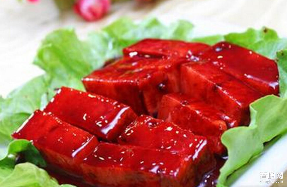 乳腐肉是浙江嘉興的漢族傳統(tǒng)名菜,乳腐肉取夾心豬肉為主料,配以冰糖、乳腐鹵、紅曲粉、黃酒等輔料。先以大鍋燒煮,再盛碗放入蒸籠,用文火續(xù)蒸。肉質(zhì)酥糯,香味濃郁。但南北做法稍有差異。成品色澤紅亮,肥而不膩,是春夏的時(shí)令菜肴。