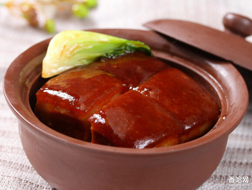 制作方法:將帶皮五花肉切成方塊,每塊肉上剞十字刀紋。將肉塊放入清水中煮至五成熟時(shí)撈出。將鍋底放一層姜片,將肉塊擺上沙鍋內(nèi)(皮朝上)。肉上面放筍片,加料酒、醬油、冰糖、清水,先用旺火煮沸,再用小火久燜2小時(shí),至肉酥爛味透時(shí)加入味精起鍋裝盤,肉皮朝上。將炒熟的菠菜放入肉盤的兩端,兩邊擺上蒸熟的荷葉夾,撒上蔥花、胡椒粉即成。