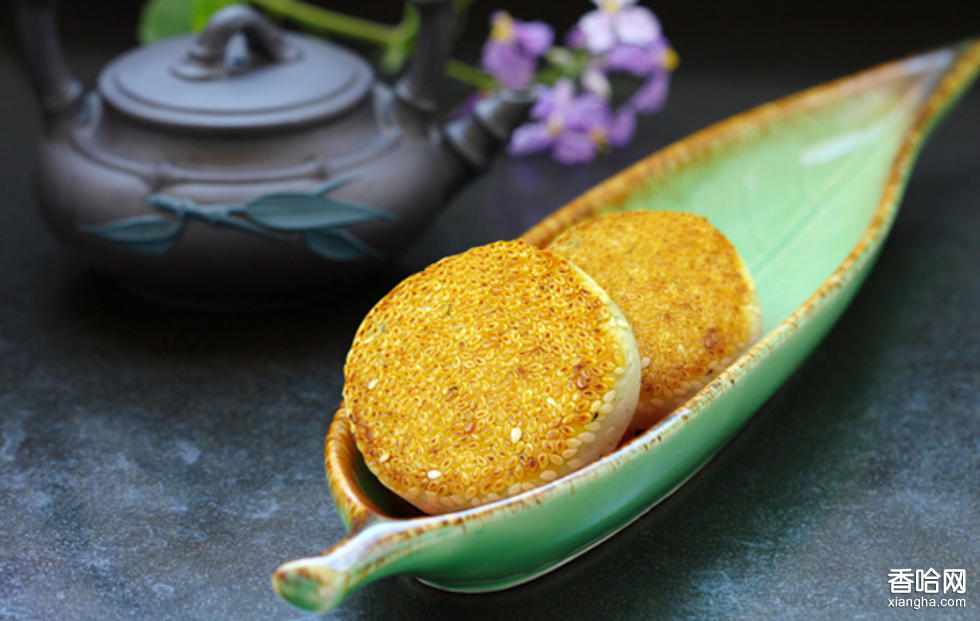 4.烘焙:用急火,爐溫350℃左右。進(jìn)爐時餅面在下,烘焙1分鐘左右,翻面,再烘焙約1分鐘,芝麻炸裂有聲時,即可出爐。