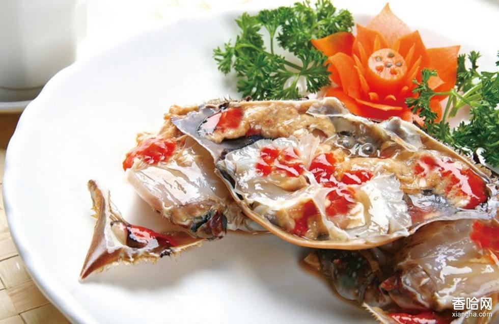 紅膏熗蟹是浙江寧波傳統(tǒng)的漢族小吃,色彩艷紅、鮮咸滑嫩。在盛器中放入冷開水,加鹽、白酒、蔥、姜,調(diào)成濃咸鹵,再將洗凈后的紅膏蟹放入,浸腌8小時(shí)后即可。紅膏咸槍蟹都是東海里的野生梭子蟹做的,個(gè)頭壯實(shí),有紅膏,蟹背殼上有小孔,可以看到紅膏,肉質(zhì)飽滿。