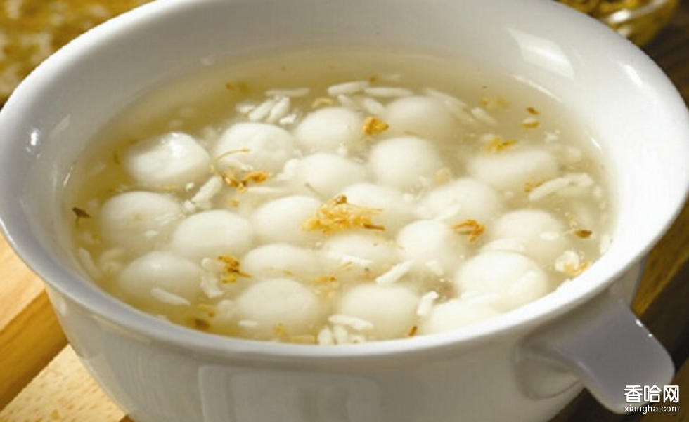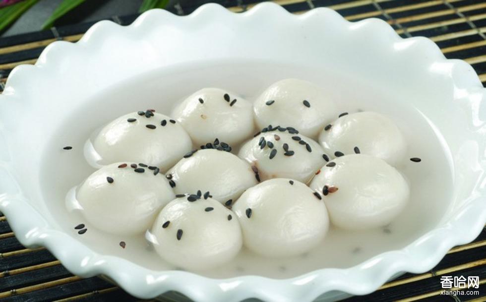 主要作料為糯米、黑芝麻、豬油、白糖、桂花等。采用吊漿技法,將糯米制成不干不粘的水磨粉;再將黑芝麻熟研末,加入豬板油丁、白糖等拌成餡心;以水磨粉為皮坯,包入餡心搓圓,置沸水鍋內(nèi)煮熟后,撒上少量白糖、桂花和紅綠絲即成。特點(diǎn)是,色白發(fā)光,糯而不粘,皮滑餡潤,滋味香甜。