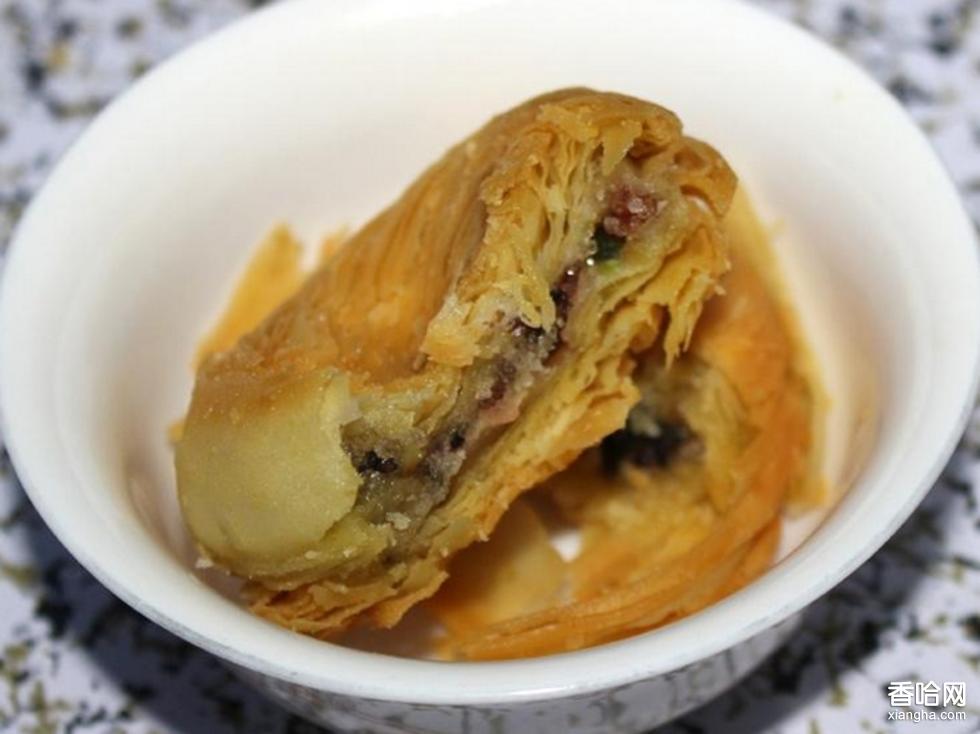 制作方法:1.制皮:先將水、油、糖攪拌均勻,再加入面粉制成均勻、光滑的面團,蓋布回餳。2.制酥:將油、面拌勻。3.包酥:按皮95克、酥55克進行小包酥,經搟、折包好后,卷成長條備用。4.制餡:將白糖、豬油在一起拌勻、擦透,然后將各種小料切碎擦拌均勻即可。5.包餡:將包酥后卷成的長條,順長切成兩半,作成明酥,刀口切面向上,按扁后搟成圓片,包入餡心。包好后每只重125克,用手拍成直徑7厘米的圓坯即可。6.炸制:將生坯放在鐵篩內,留一定間距,放入130℃熱油中,炸至外殼發(fā)硬,表面呈淡黃色即可。