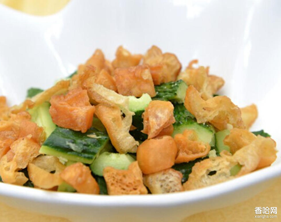 材料:黃瓜一根、隔夜油條兩根、寬粉二兩、芝麻醬適量、芝麻油適量、鹽3克、蒜泥5克