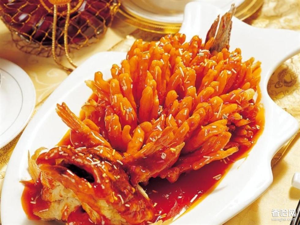 1.炸桂魚生坯,旺火熱油炸定型,中火溫油炸熟透,再用旺火熱油沖炸上色,熘時(shí)魚形完整,形象逼真。