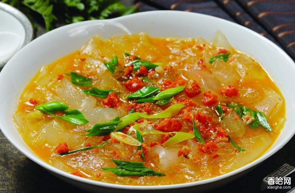 原料:蟹粉50克,特色粉皮300克,青蒜末。