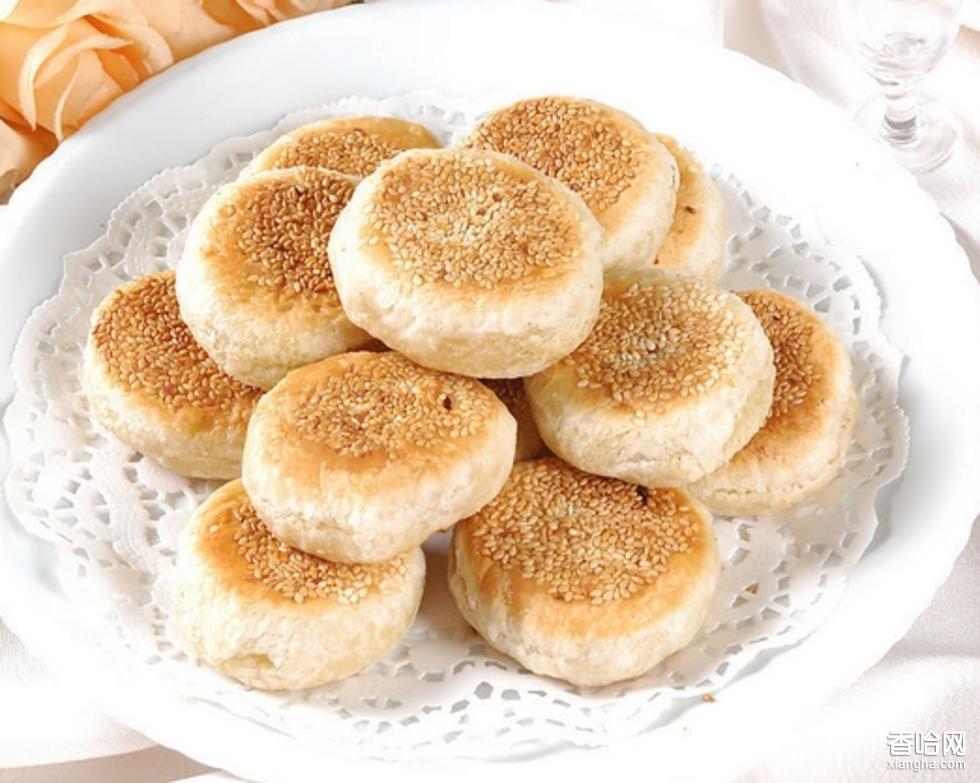 餡料:蒸熟標準粉8.25千克糖桂花1千克炒熟糯米粉1.05千克熟豬油3.5千克綿白糖11.5千克熟芝麻(貼麻用)16千克制作方法:1.制皮:將特制粉攤成盆狀,將熟豬油、飴糖倒入其中,加入熟水拌勻制成面團。2.制酥:先將糖、糖豬板油放在一起擦透,使脂肪泄出,再加水,加入熟面粉,桂花拌勻。3.制餅坯:用大包酥方法,一分皮子包一分酥和餡料,撳成圓餅,二面沾水和沾白芝麻,擺在鐵盤里。4.烘焙:將餅坯放進烘爐,2分鐘后,當餅皮開始泛白時,將鐵盤取出,逐個翻身,再進爐烘焙,約5分鐘后,待餅皮鼓起,餅色泛黃,芝麻膨脹時,便已熟透,出爐冷卻后裝箱。5.貯存:由于該餅酥脆,裝箱時宜輕拿輕放,以防酥皮破碎和芝麻脫落,并儲于通風陰涼處。