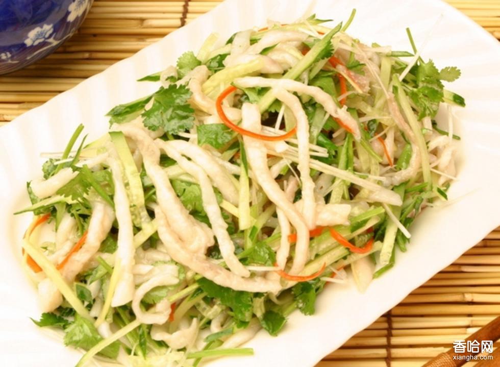 用快刀剖斬活鮮鮮的金鯉魚,取它兩肋之肉,切成八寸長的細(xì)絲,浸以陳醋等魚絲成粉白狀取出裝盤,再將“金針”、“瓜葉香”等山珍的細(xì)絲陳放盤中,翠綠、金黃、粉白相映成趣。最后,澆入鮮嫩黃瓜汁、香菜汁、糖蒜汁、小磨香油、姜汁等佐料。吃了以后,回味無窮,以嫩脆鮮香、滑爽適口而聞名。