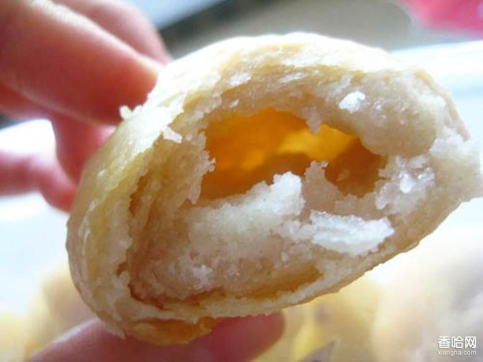 其制法是取炒熟碾碎的芝麻200克,加入白糖1000克、面粉500克、玫瑰醬200克、食油100克拌勻成玫瑰餡。取面粉2750克、豆油200克、水1150克和成軟硬適可的水油面團(tuán);取面粉1500克、油750克,和制成油酥面團(tuán)。先把水油面團(tuán)揉勻,搟成邊薄中厚的長方形,再把搟成長方形的油酥面放在水油面上,用手按平,搟薄卷成小劑,包入餡心,再搟成圓餅,入烤爐中烤至金黃色即成。