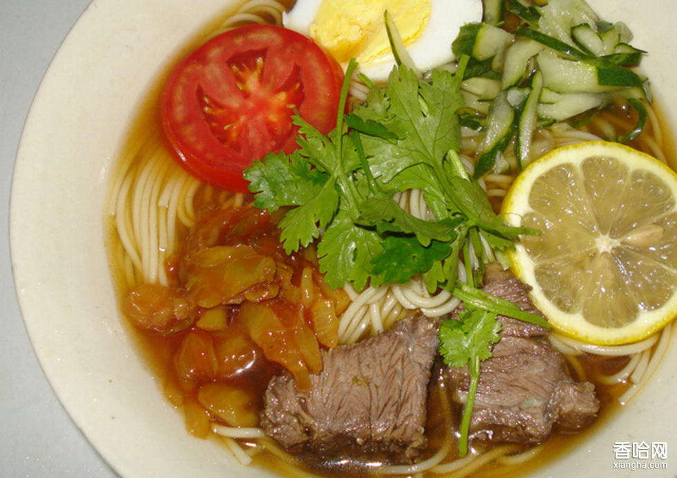朝鮮冷面的制作材料:蕎麥面1000克,土豆淀粉1500克,精牛肉600克,白菜2500克,梨500克,雞蛋絲150克,熟芝麻25克,辣椒粉50克,蒜泥50克,姜末3克,醬油600克,醋精25克,芝麻油15克,食堿50克,精鹽100克,味精4克。朝鮮冷面的特色:色鮮艷,面條筋道滑爽,湯味清香可口。