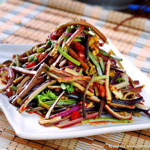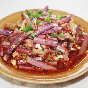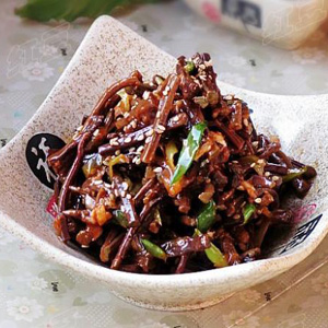 這道涼拌蕨菜粉中也放入了辣椒來調(diào)味,色澤紅亮,在視覺上就使人很享受。辣椒具有的芳香氣味,具有很好的開胃效果,所以這道菜是一道非常下飯的佳肴。