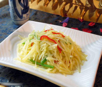4、熱鍋加花生油炒土豆絲,由于土豆絲有點(diǎn)難熟,所以加了少許水煮至八成熟,后裝起備用;