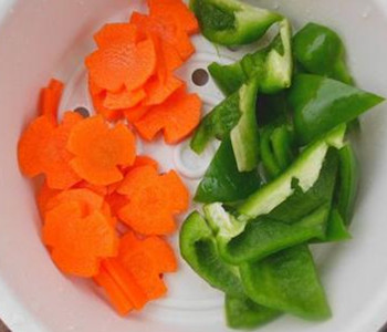 1、胡蘿卜去皮洗凈,切菱形片。青椒洗凈,切小片。蔥姜蒜切碎。