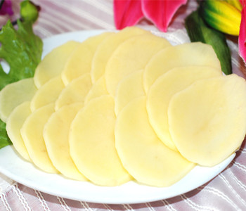 2、準備一盆清水并入一點鹽,以防土豆變色。土豆切成隨意的片狀,厚度與一元硬幣;