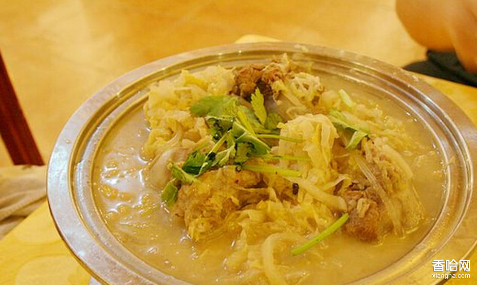 北林酸菜湯是綏化當?shù)靥厣酥弧{}分兩次分別加到排骨和酸菜里,最后混合后嘗咸淡,咸要加熱水,淡就加鹽。因為主要喝酸菜湯,湯正好就成,排骨淡可以蘸蒜泥醬油吃。