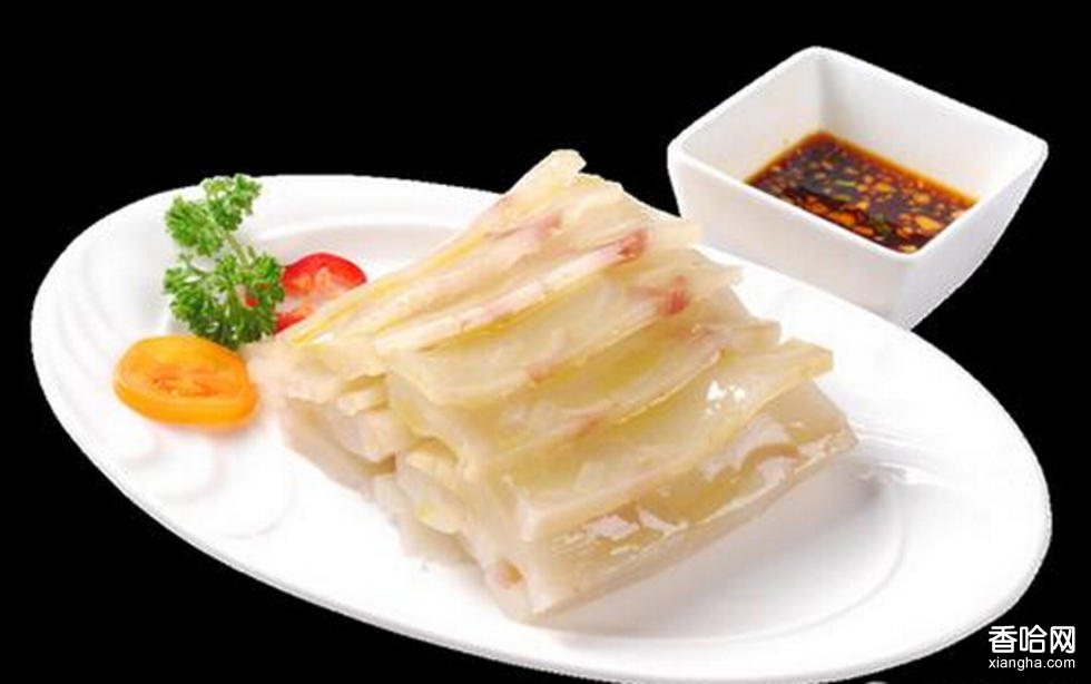 一口豬豬皮凍將除了毛的豬皮,放入適當?shù)恼{(diào)料,進行長時間的熬制,使熬制的湯里含有一定的皮膠含量,然后再冷卻,冷卻后豬皮和湯就會凝固在一起,沾上調(diào)料,即可食用。因為是冷卻后食用,冷卻可以說作是冷凍,所以叫作豬皮凍。