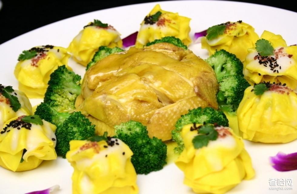 19.取雞,胸脯朝上撈入大湯盤中,蛋燒賣轉圍放在雞的周圍;