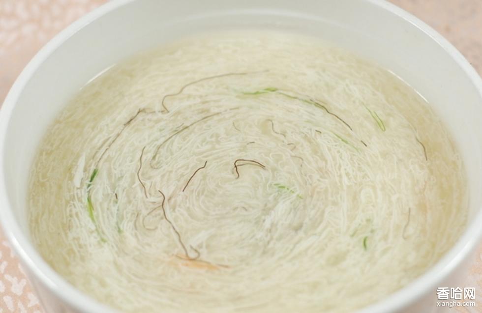 9. 另取鍋置火上,舀入雞清湯500毫升,沸后投入豆腐絲,待豆腐絲浮上湯面,即用漏勺撈起盛入湯碗內上桌。