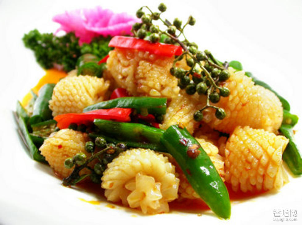爆烏花,漢族名菜,屬淮揚菜系,以烏賊魚炒制而成,口味鮮嫩。將鮮墨魚洗凈,取其肉片,剞成交叉花刀塊,放入開水中氽一下,瀝凈水待用;花生油旺火燒至六成熟,投入蔥末、姜末、蒜末炸香后放入烏花、玉蘭片、木耳、青豆、香菜,加入料酒、白糖、味精、精鹽,用濕淀粉勾芡,裝盤后撒上胡椒粉即可。