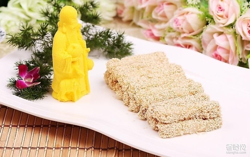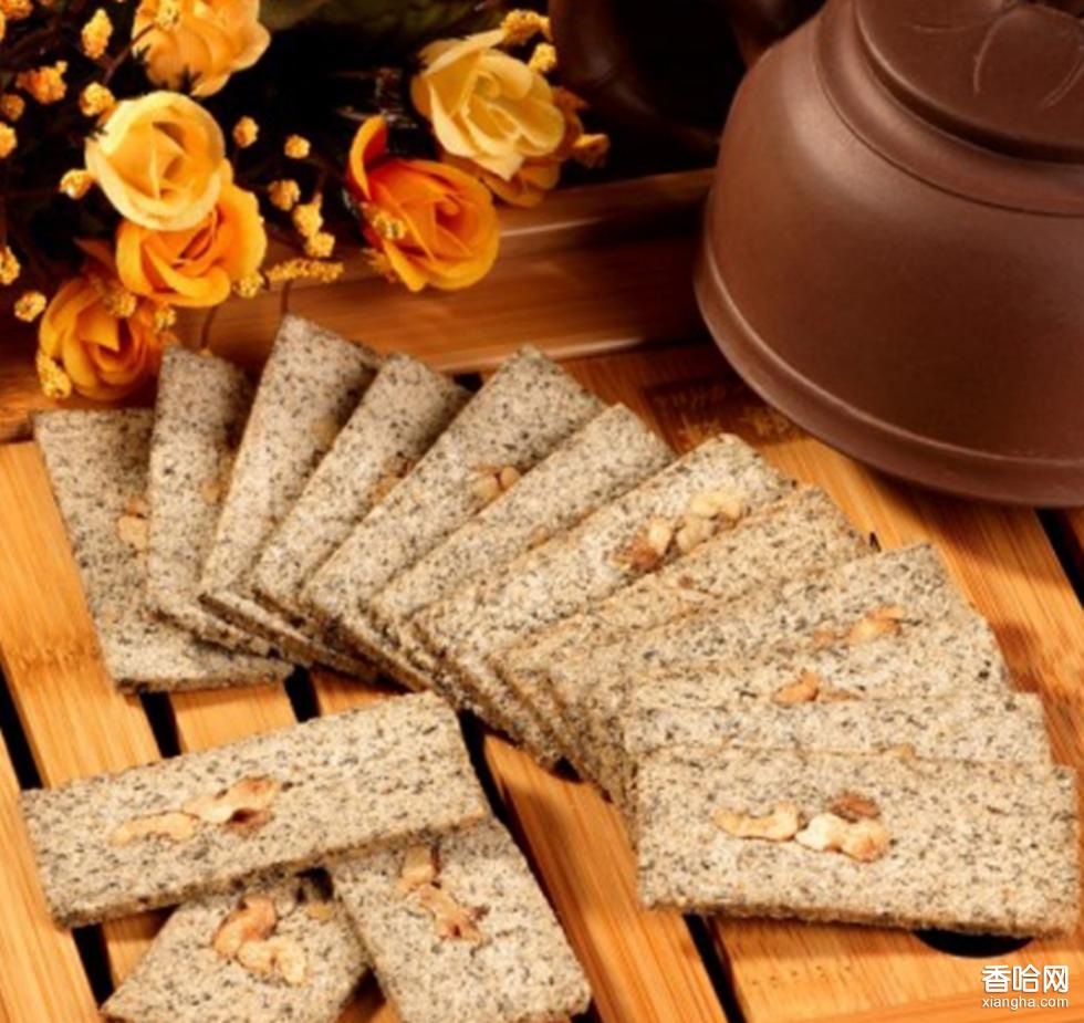 選用芝麻粉、白糖、炒米粉及核桃仁等原料,精工細(xì)作而成。每斤兩條,每條五十片上下,片片色澤金黃,嵌桃均勻,香、甜、松、酥。干吃,酥而甜,有一股濃郁的芝麻清香,泡食,香味四溢,爽口而不膩。