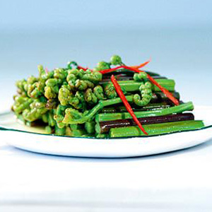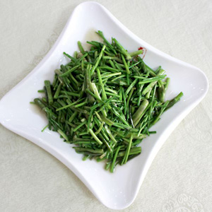 還有一個(gè)小訣竅,就是一定要大火猛炒。將新鮮蕨菜過水焯之后,放入冷水中浸泡,時(shí)間要長(zhǎng)一些,盡量在一個(gè)小時(shí)以上,然后撈出開大火猛炒,只要炒到蕨菜微微有水分浸出,馬上放調(diào)味料出鍋。這樣炒出來(lái)的蕨菜就清爽鮮甜,沒有之前苦澀的味道了。