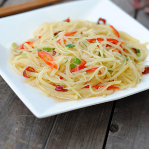 準(zhǔn)備材料:土豆500克,尖椒、蔥花、蒜茸、干辣椒絲、米醋、鹽、味精、花生油、花椒油各適量