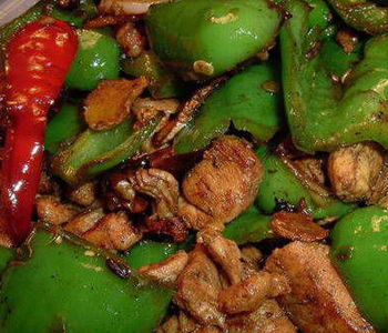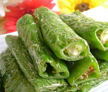 (2)鍋留底油,下入炸好的青椒,調(diào)入精鹽、醋、味精等炒勻,起鍋裝盤即成。