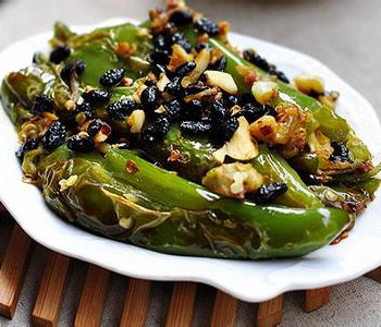(2)鍋內(nèi)留底油燒熱,倒入煸好的青椒,加入豆豉、鹽、白糖、姜末稍炒,淋上醋即可