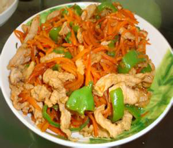 青椒胡蘿卜炒肉絲食料準(zhǔn)備:青椒2個(gè);胡蘿卜100g;豬肉150g;配料花生油適量;鹽適量;蔥5g;姜3g;蒜3g;料酒10ml;黃豆醬油15ml;味精適量。