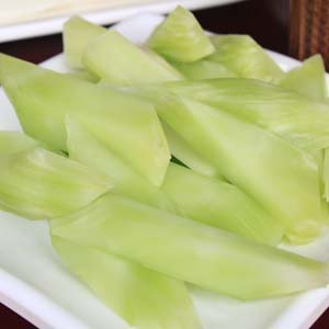 取用6月分的葛苣加工,削去皮和老筋,以凈萵苣每10公斤配用食鹽1800克為列。初制時,將萵苣順序碼放缸內(nèi),先用800克食鹽分層撒腌,每天翻動2次,揚湯散熱,使其鹽粒融化,并注意避免萵苣折斷。第3天起再用鹽1000克分層復(fù)腌,每隔兩天翻動互次,連翻5次后,再用石塊壓緊封缸貯存,前后共腌制20天即成淺黃色、脆嫩的食品。