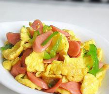 主料:青椒150g、雞蛋2個(gè)、火腿腸100g