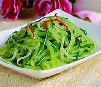 清炒萵筍絲:萵筍1棵,大蔥1小段,大蒜2粒,油1匙,鹽適量高湯1匙雞精1小匙。首先,我們還是將萵筍削皮后切絲,大蔥切成蔥花,接著在鍋里油燒熱后下蔥花爆香,然后倒入萵筍絲,翻炒片刻后放鹽,再炒勻后依次淋上高湯、放入蒜泥。最后放雞精快炒幾下出鍋,這道菜,便就算是完成了。