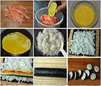 接著將蛋打散后,加少許鹽調(diào)味,放入平底鍋中煎成蛋皮后切作長(zhǎng)條。趁油鍋還熱把紫菜包飯切成條的火腿炒一炒,一定要注意火候不要焦也不要不熟。一切準(zhǔn)備就緒,開(kāi)始包,拿出兩張紫菜細(xì)細(xì)鋪好,米飯倒在上面倒上四分之三。用手弄散鋪滿紫菜的四分之三的每個(gè)角落,不要太用力把米飯壓得扁。(然后按順序放上雞蛋條、火腿條、菠菜,最后是腌蘿卜)