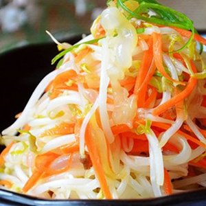 材料:綠豆芽300g,海蜇絲250g,胡蘿卜50g
