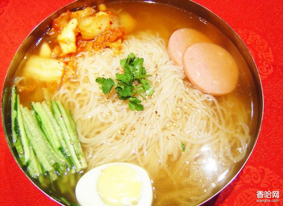 冷面亦稱股細和涼淘,是朝鮮和韓國及中國東北朝鮮族的傳統(tǒng)食品,在風味及用料和制作工藝上主要分平壤冷面和首爾冷面,是用蕎麥面或小麥面(也有用玉米面、高粱米面、大米面、榆樹皮面的)加淀粉加水拌勻,壓成圓面條,煮熟后浸以冷水,再去冷水伴牛肉片、辣椒、泡菜、梨或蘋果片、醬醋、香油、香菜、黃瓜、水蘿卜片等佐料,加入牛肉湯即成。