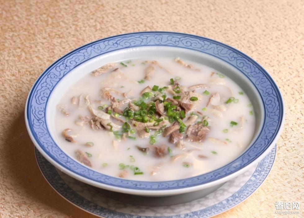 羊肉湯主要將羊骨頭(筒子骨)一起投入大鍋里熬湯,再將切成砣的新鮮羊肉與清洗干凈的羊雜一起投入湯鍋中煮。煮熟后撈起來瀝干,然后切成薄片放入滾開水里一氽,再倒入湯碗中,沖入滾燙雪白的羊湯水,撒上碧綠的蔥花,一碗熱氣騰騰,香氣四溢的羊肉湯就做成了。配上一個由海椒面、花椒面、鹽巴、味精等調和就成羊肉湯。