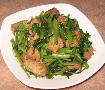 3、香菜根炒牛肉。香菜根洗凈,牛肉切絲,油熱后依次放入蒜末、蔥花、肉絲爆炒,而后放入香菜根,加入鹽、味精、香油、紅油,裝盤(pán)食用。