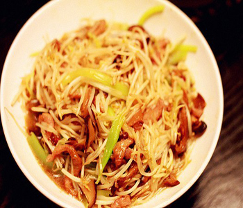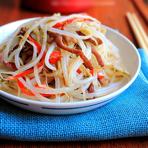 材料準(zhǔn)備妥當(dāng)以后就可以開始做了。先將綠豆芽摘去根,洗干凈,控去水分。再把豬肉切成絲。在鍋內(nèi)倒入底油,燒到8成熱,下入肉絲均勻煸炒,再加入醬油、料酒、白糖翻炒均勻。待肉絲微卷,即可盛出。接下來另起一個(gè)鍋,鍋內(nèi)放油,燒熱,先放入精鹽,隨即把綠豆芽倒入。待豆芽炒至半熟時(shí),將肉絲倒入,炒到豆芽熟了,即可出鍋。