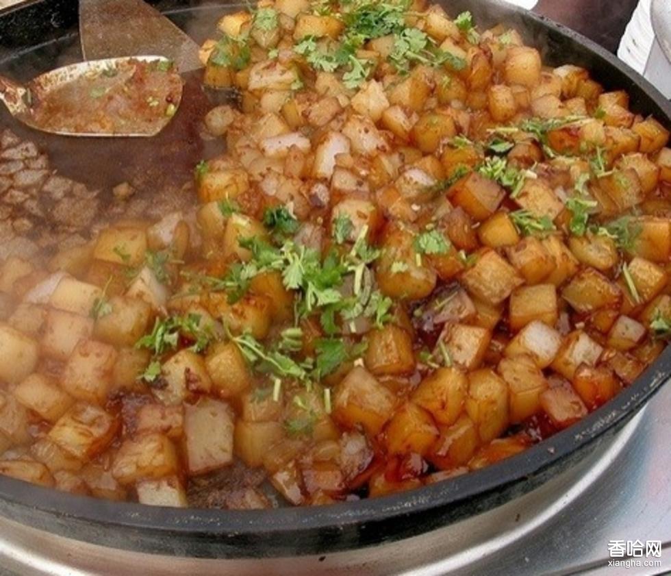 燜子原料是淀粉,用特殊的方法制成象涼粉一樣的東西,切成二、三厘米見方的小塊,呈半透明狀,把這些小塊在平底煎鍋里煎熟,稍微有點焦,再淋上醬油、醋、麻油、香油、芝麻醬等調(diào)料,撒上蔥末、蒜末等調(diào)味品