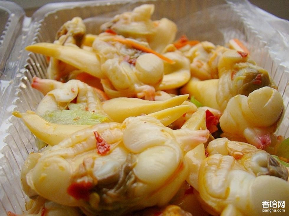 涼拌黃蜆子主料是凈鮮黃蜆子,配料是韭青,調(diào)料是醬油、芥茉、香油。將鮮蜆子洗凈,用開水燙至開口時撈出;把蜆子肉取出,再用清水洗凈,瀝干水分待用。韭青洗凈,放入開水內(nèi)燙透,用涼水淘涼取出,控凈水分裝盤。上面放蜆子肉,用以上調(diào)料兌好的汁,澆上即成。