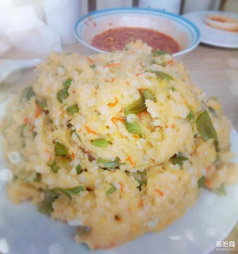 ①將土豆去皮,擦成絲,將土豆絲放在罩笠中,放在水龍頭上沖水,不要把水控的太干,連水一起將土豆絲和蒸熟的大米倒入面粉中,使土豆絲和米飯掛水相對均勻(面與土豆絲以及米飯的體積的比例大約為1:1.5,邊加土豆絲和大米邊用手?jǐn)嚢瑁W罱K將所有土豆絲和大米都拌好,使每一根土豆絲和米粒都裹上面。
