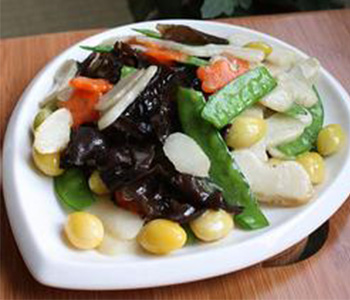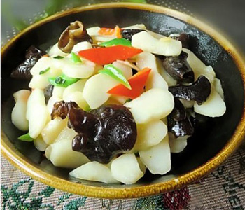 2、炒鍋燒熱放入熟花生油,燒至七成熱,即將冬菇、荸薺片同時下鍋煸炒,放入醬油,姜末,精鹽,白糖,味精,料酒,鮮湯150克,燒開用濕淀 粉勾芡,淋熟油起鍋裝盤即成。