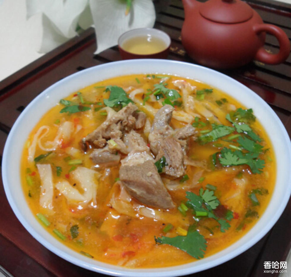 羊肉胡卜”不是羊肉和胡蘿卜,這里的“胡卜”指的是一種死面餅子,是山西運城地區(qū)的久負盛名的特色小吃,尤以北相鎮(zhèn)的最為著名,故稱“北相羊肉胡卜”,距今100多年歷史。它的做法是:把烙熟的白面薄餅切成絲條狀,加鮮羊肉湯煮燴,再調(diào)以香油、蔥花、辣椒等調(diào)料。吃起來清爽可口,油而不膩,極富營養(yǎng),因而遠近聞名,是運城人一年四季離不了的美味。