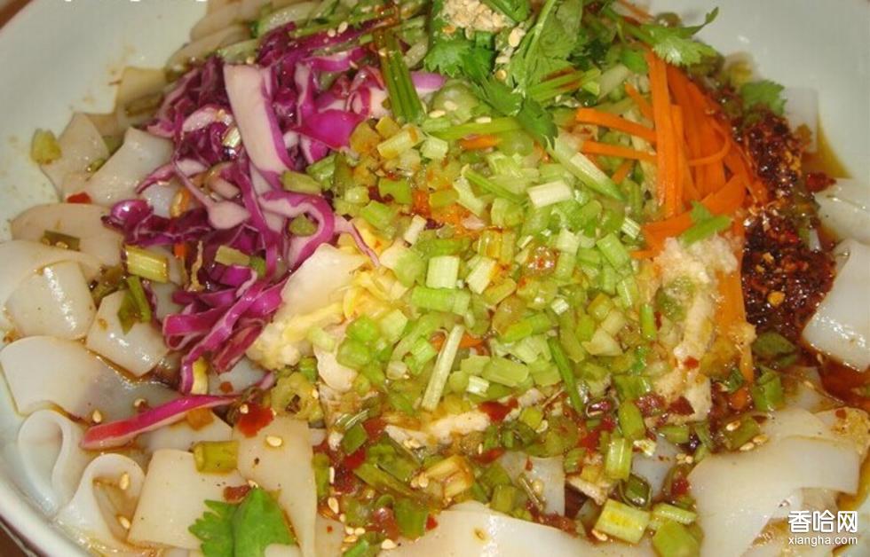 用小麥面加工的大眾食品。在小麥面中摻和適量堿面(最好用土法制造的稱為“蓬灰”的堿),用溫水調(diào)成硬性面團;幾經(jīng)揉搓,等面團揉勻光滑,再放進盆中用涼水連續(xù)揉洗,洗去淀粉,直到面團洗成蜂窩狀的軟膠狀時為止。這膠狀體蒸熟后就稱為“面筋”。洗出的淀粉水待沉淀后,倒出浮水,將沉淀面糊舀在鋪有蒸布的籠中,蒸熟成3分厚的圓餅,即為“釀皮”。另一種作法是把面糊舀入特制的鐵盤中(俗稱“煸鍋”),用水浴煮熟,從盤中剝離出來。前者為蒸法,后者為餾法。蒸的色褐沉著,渾厚肥大;餾的色黃發(fā)亮,薄細柔嫩。