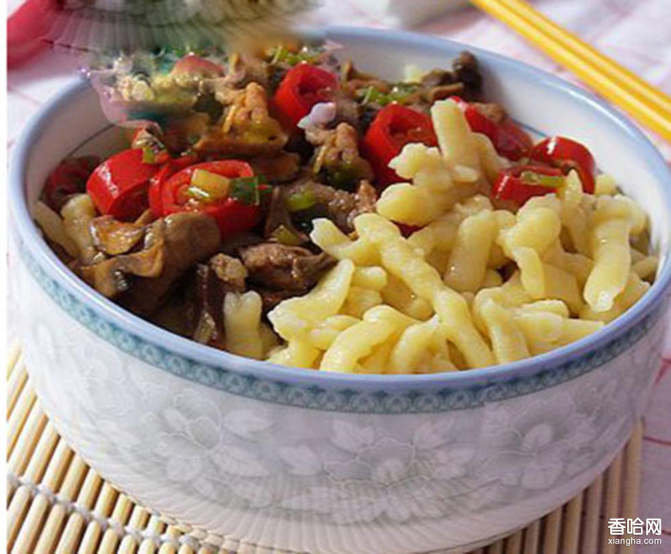 空心面:在較細(xì)的搟面杖上涂些食油,把搟勻的面片纏在上面,在面卷外邊涂一些食用油,然后將搟面杖抽出后,仍按拉制勾面的方法反復(fù)抻拽,即成空心面。